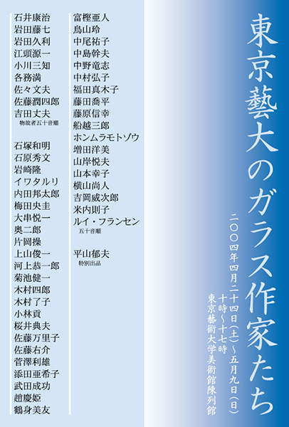 東京藝大のガラス造形講座設立を記念して、藝大出身の作家、デザイナーらの作品 −工芸品、オブジェ、ステンドグラスなど− により、昭和初期から現在にいたる日本のガラス造形の歴史を展覧 期間:2004.04.24-05.09 会場:東京藝術大学大学美術館 陳列館(台東区上野公園) 主催:「東京藝大のガラス作家たち」展実行委員会